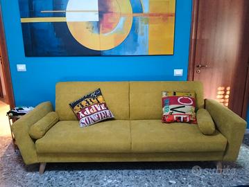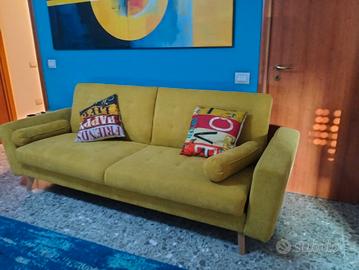 Divano letto a tre posti stile scandinavo, comodissimo sia come seduta che come letto. facile da aprire e chiudere e confortevole per la schiena. colore giallo cumino Creep. due cuscini laterali e gambe in legno. il costo all'acquisto era di 1100,00 euro. È stato acquistato neanche due anni fa e lo vendo causa trasloco. Made in Francia. dimensioni compreso i braccioli 230 cm x 100 cm di profondità.