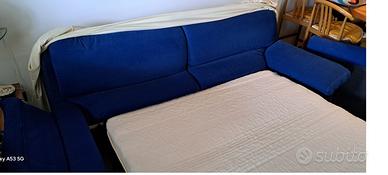 Regalo divano letto blue a due piazze: misure 200cm x 90cm x 85 cm. Solo ritiro a mano da parte di chi lo prende. Sono all'interno di un villaggio al piano uno. Copridivano beige