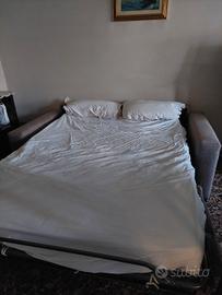 Divano in tessuto grigio melange, larghezza 2 metri, profondità 1 metro. Diventa letto due piazze molto facilmente.