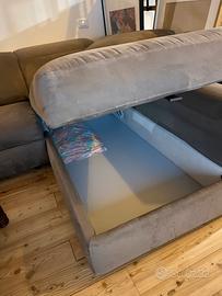 Vendo divano a L angolare, letto apribile, con scompartimento contenitore rialzabile, in ottime condizioni, quasi nuovo.