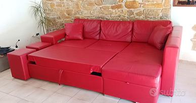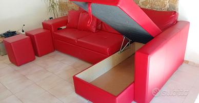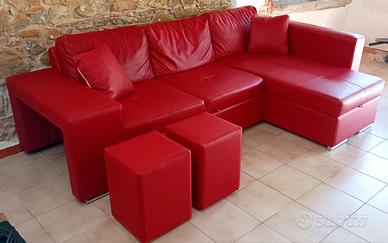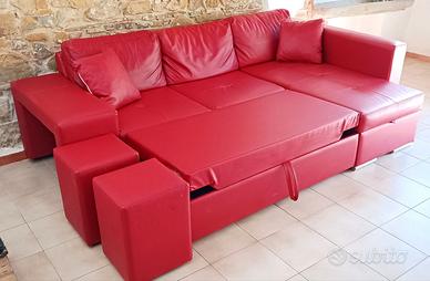 Vendo divano angolare in ecopelle rossa, in buone condizioni, moderno e molto versatile. ✔ Dimensioni: Lunghezza totale: 250 cm Penisola: 160 cm (dallo schienale) Lato corto: 90 cm (dallo schienale) ✔ Caratteristiche: Funzione letto estraibile (come da foto) Contenitore capiente nella penisola Inclusi 2 pouf coordinati Seduta ampia e comoda, tessuto facilmente lavabile. ✔ Condizioni: Il divano è in buono stato generale. Presenta solo un piccolo strappo nel vano letto (su un bordo interno), non visibile quando il divano è chiuso. 💰 Prezzo: 300€ Ritiro a carico dell'acquirente
