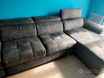 Divano letto estraibile angolare con penisola a sinistra. Facile da pulire, basta un panno in microfibra. Tre poggiatesta regolabili. Colore grigio. Tessuto lavabile. Misure 287 larghezza 176 profondità e 78 di altezza