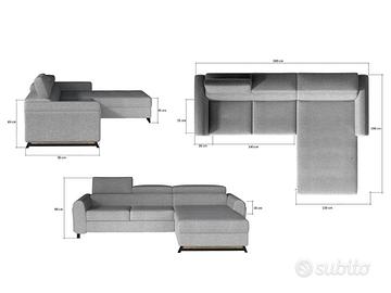 Un divano angolare ad L pratico e funzionale è sicuramente il divano angolare Andorra. Come altri modelli similari anche l’Andorra ha in dotazione un box contenitore di ampie dimensioni, una funzione letto con sistema relax, due poggiatesta reclinabili e piedi in metallo. Per quanto riguarda quest’ultimi i piedi finali della chaise longue sono di nuova generazione e sono tra loro collegati da un’asta robusta e resistente che di fatto li unisce e li rende un corpo unico. Da un punto di vista del design il nostro divano angolare Andorra è caratterizzato da braccioli di dimensioni compatte e non larghe e questo fa sì che sia la seduta dello stesso, ma anche la funzione letto (110 x 240 cm) siano di ampia lunghezza aumentando così la praticità del divano stesso. Anche la seduta del divano angolare ad L pratico Andorra risulta essere pratica e funzionale ed una volta alzati i poggiatesta anche di un’altezza importante (98 cm). Divano angolare robustissimo e di buona qualità, dal peso di ben 148 Kg! Sottolineiamo che il rivestimento della funzione letto che fuoriesce può essere di colore diverso da quello evidenziato in foto e comunque non è in tinta ed è differente dalla combinazione di colore del divano che si sceglie. Misure: lunghezza 300 cm – altezza 98 cm – profondità 190 cm – dimensione letto 110×240 cm EXCELLENT LINE – GARANZIA DI 2 ANNI COME DA NORMATIVA EUROPEA STRUTTURE INTERNE E RIVESTIMENTI MOLTO RESISTENTI PRODOTTO ROBUSTISSIMO E DI ALTA QUALITA’! SCHEDA TECNICA: Struttura divano: legno massello, legno semilavorato e legno artificiale. Cinghie di sostegno in ferro. Seduta: imbottitura in uno strato di schiuma di poliuretano alta resilienza dalla densità di 40 kg/m3. Braccioli e schienale: imbottitura di schiuma di poliuretano dalla densità di 30 kg/m3