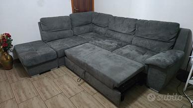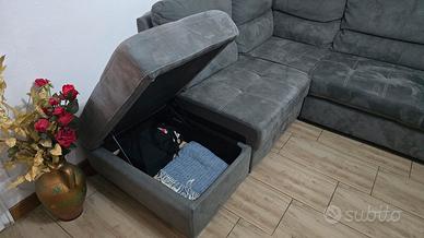 Vendo divano letto angolare di color grigio scuro con pouf contenitore e letto con meccanismo estraibile. Come nuovo, comprato meno di un anno fa. Vendo per trasloco. Dimensioni: 267×232×100 cm Trasporto a carico dell'acquirente a Ferrara.