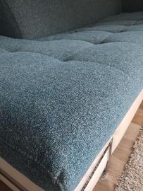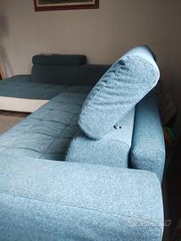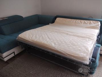 Divano letto angolare Misure 290*230 profondità 100 cm Poggiatesta reclinabili in diverse posizioni. Base in similpelle, sedute sfoderabili e lavabili. Piedi in metallo cromato lucido Aperto diventa letto a tre piazze. Materasso molto comodo, usato poche volte.