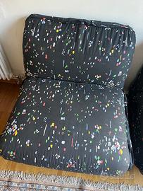 Regalo divano letto composto da due poltrone che diventano due letti singoli. Le poltrone sono unite da una struttura in ferro, si avvicinano per formare un matrimoniale e si separano una ventina di cm per due singoli.
