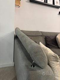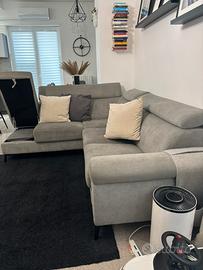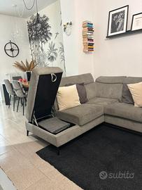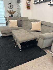 Splendido divano letto angolare grigio, con vano contenitore, panca estraibile per la modalità letto e poggiatesta regolabili. Comodo, di design e molto utile