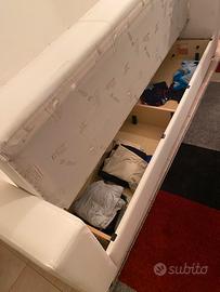 Vendo divano letto una piazza e mezza, con contenitore . Il divano ha un unico difetto il bordino si sta screpolando come in foto .