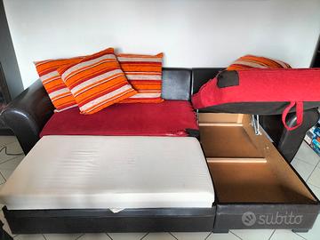 divano letto con ottima struttura,2 posti più chaise longue contenitore. per i 4 cuscini compresi nel prezzo. Tappezzeria rovinata per vissuto con gatti risolvibile con un copridivano.