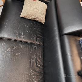 Divano letto con rete elettrosaldata e vero materasso in ottimo stato generale. Prezzo simbolico per mancato utilizzo. Rivestimento in simil pelle nero che presenta delle screpolature. No tagli e/o rotture solo screpolature della finitura in simil pelle naturali per questo tipo di rivestimento. Utilizzato pochissimo cuscineria e materasso in ottimo stato. Apertura meccanismo a molle con cuscini ribaltabili. Trasporto a vostro carico previo accordi