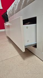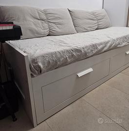 BRIMNES IKEA divano letto singolo o matrimoniale bianco con 2 materassi e 2 cassetti 2 cuscini in omaggio Divano di giorno e letto singolo o matrimoniale di notte. I due grandi cassetti ti offrono tanto spazio per tenere a portata di mano piumini, cuscini e lenzuola. Unici difetti visibili in foto nel cassetto NO SPEDIZIONE RITIRO E SMONTAGGIO A VOSTRO CARICO