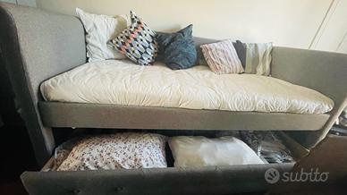 Divano letto in tessuto colore grigio effetto capitonne' idoneo per due materassi dimensioni 90x190 (di cui uno compreso nel prezzo). Struttura in legno doghe in legno per entrambi i letti.