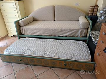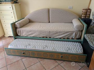 Divano letto cassettone con doghe Legno frassinato e decorato a mano con stencil stile Siviglia verde acqua Valuto anche la vendita dei materassi