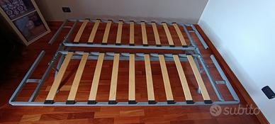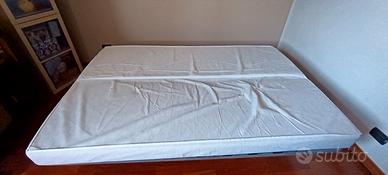 Divano a tre posti a doghe che si apre e diventa matrimoniale. Materasso in gomma piuma. Misure aperto 190x130. Misure chiuso 190x80x100 Struttura e doghe in ottimo stato. Materasso usato. Compreso il copridivano imbottito e due cuscini
