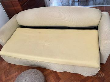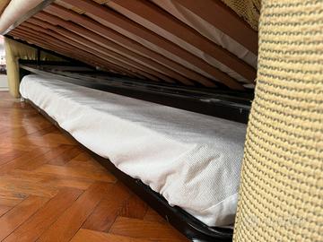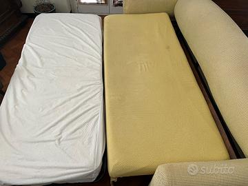 Divano letto, composto da due letti singoli molto comodi con doghe in legno. Imbottitura, materassi e rivestimento sono nuovi, completamente sfoderabile. Copertura della seduta con piccoli segni di usura. Braccioli e schienale sono estraibili e facilmente trasportabili.