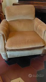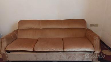 Divano letto (una piazza) a tre posti, in velluto giallo ocra e due poltrone. Si possono vendere anche separatamente il divano o le due poltrone.
