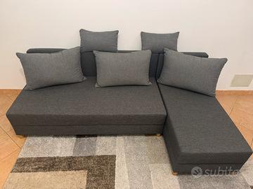 Divano 3 posti in tessuto. Il divano si trasforma facilmente e velocemente in un letto. Cuscini di seduta e schienale in schiuma. Con vano contenitore. Reversibile. Misure letto 110x213 cm. L214 x H69 x P81/122 cm. set 5 cuscini. PREZZO TRATTABILE