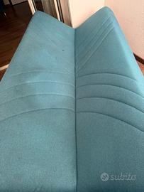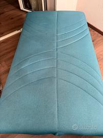 Divano letto in tessuto 3 posti colore verde con contenitore in legno mai usato .