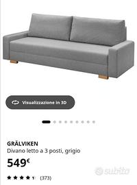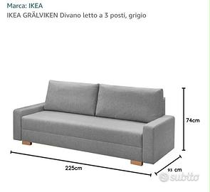 Divano letto mod. Gralviken Ikea, come nuovo perché mai utilizzato, 3 posti, colore grigio, i cuscini della seduta, imbottiti con schiuma di poliuretano e fibra di poliestere, offrono un comfort di seduta solido e di supporto. Il pratico ed ampio vano contenitore sotto il sedile è sufficientemente ampio per riporre lenzuola o altri oggetti. Dimensioni letto larghezza 140 lunghezza 195 Dimensioni Divano in foto. Ritiro e trasporto a carico dell'acquirente.