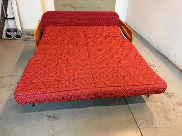 Divano letto a due posti in ottime condizioni. Rivestimento in tessuto rosso con fantasia a pois dorati, molto caratteristico ed elegante. Struttura con pannelli laterali in legno chiaro che gli donano un aspetto solido e curato.