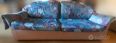 Divano con letto estraibile, ancora in buono stato. Bellissima fantasia floreale con 4 cuscini sui toni dell'azzurro e del rosa. Sembra un quadro romantico. Struttura rivestita di stoffa color rosa cipria. Trasporto a carico dell'acquirente.