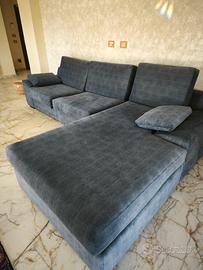 Vendo divano letto in foto con penisola in perfette condizioni, colore blu materiale tessuto vellutato con piedini in legno. Lunghezza 3,05 m Altezza 50 cm Profondità bracciolo 90 cm Profondità penisola 195 cm Ritiro Ribera