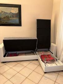 Divano letto angolare con penisola reversibile e doppio vano contenitore che troveremo sotto la penisola e sotto la seduta. Per trasformarlo in letto basta applicare una leggera pressione sullo schienale e questo, spingendo in avanti la seduta, si aprirà a libro.