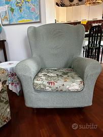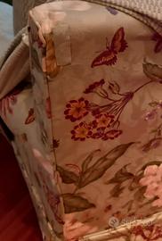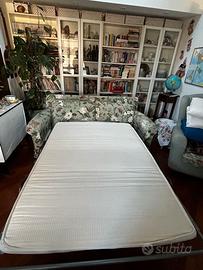 Divano letto e poltrona in tessuto fantasia, disponibili copridivano e copri poltrona in tinta salvia come da foto poltrona. Valore aggiunto: prodotto artigianale. Letto matrimoniale alla francese. Piccolo difetto dietro al divano come da foto. Meccanismo letto facile da utilizzare e perfettamente funzionante. Misure: divano 190x86x90h, materasso 190x130, poltrona 87x76x100h.