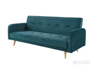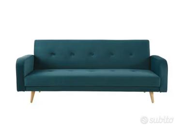 bellissimo divano letto con struttura e piedi in legno , tessuto lavabile antimacchia blu petrolio vellutato.
