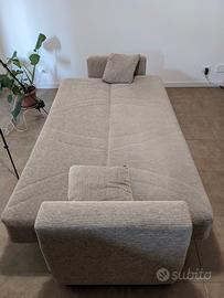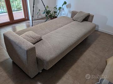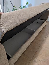 Vendo divano letto con vano contenitore. Il divano presenta segni di usura dovuti dall' uso e dal tempo (vedi foto in dettaglio) ma nulla di drammatico. Lo uso oramai da circa un annetto (coperto da un copridivano, ci tengo a precisare che la fodera non è mai stata lavata e non credo nemmeno sia sfoderabile) senza problemi ma semplicemente non mi è mai piaciuto e ho deciso quindi di sostituirlo. Trattasi di divano appartenente a ex proprietari di casa e di conseguenza non ne conosco vita morte e miracoli. Presenta un lunghezza totale, braccioli compresi, di circa 220cm per un altezza di circa 90cm. Da aperto la larghezza è di circa 115cm per una lunghezza totale della superficie utilizzabile di circa 190cm. Perfetto per chi ha una casa in affitto e vuole aggiungere un divano utile anche per un eventuale ospite. Comodo anche per la disponibilità di un vano contenitore sotto la sedute, per riporre eventuali cuscini e lenzuola per l'utilizzo come letto.