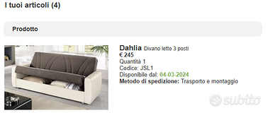 Vendo divano letto 3 posti modello Dahlia di Mondo Convenienza, con meccanismo clic/clac e pratico vano contenitore. 📏 Misure: 225 x 84 x 91 cm 🎨 Rivestimento: eco Avorio / tessuto Caffè Si trasforma facilmente in letto: basta una leggera pressione sullo schienale e la seduta scorre in avanti aprendosi “a libro”. Una volta aperto risulta comodo e uniforme, senza spazi o dislivelli. Acquistato due anni fa. Usato ma in buono stato, come visibile in foto. Vendo per rinnovo arredo. 📍 Zona Roma Piramide 🏢 4° piano con ascensore Smontaggio e ritiro a carico dell’acquirente.