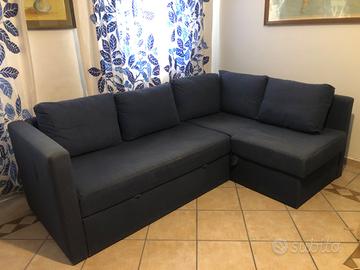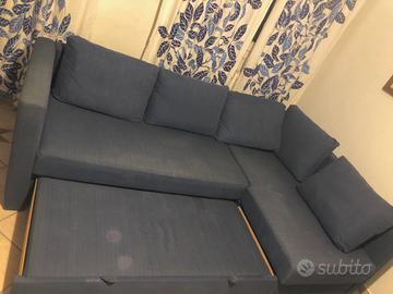 Divano letto IKEA a L, in tessuto blu, tre posti con chaise longue con funzione di ampio contenitore. Dotato di 5 cuscini sfoderabili.