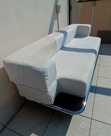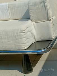 È un curioso divano che, ruotando lo schienale, diventa un letto ad una piazza. Lo stile è quello classico Bauhaus degli anni Sessanta con tubo cromato e piano in laminato plastico. Piedi in legno laccato nero di forma conica. Mostriamo con piacere l'oggetto di persona a chi è interessato, siamo in provincia di Ascoli Piceno. Naturalmente, possiamo anche spedirlo in tutta Italia. Le condizioni del mobile sono buone, ma per l'usura degli anni, il rivestimento dello schienale si è logorato in un punto e pertanto è stata applicata una pezza, che è ben visibile nelle foto. Comunque, regaliamo un rivestimento nuovo, già tagliato a misura e da cucire sul modello dell'originale.