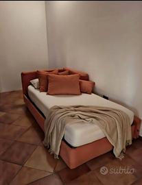 Divano letto moderno in tessuto arancione e ricambio beige, ben tenuto, ideale per soggiorni o camere ospiti. Si trasforma facilmente in letto matrimoniale ( meccanismo a ruote) con un solo gesto. Rete a doghe robusta, perfetto per ospiti improvvisi ho per arredare il vostro soggiorno con la vostra cameretta per uso quotidiano [1][2][3].