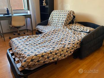 Divano letto composto da due letti indipendenti, utilizzabili sua singolarmente sia in coppia . Misure: larghezza da 177 (le due poltrone unite) a 220 (poltrone aperte). Profondità: 100 la seduta chiusa, 200 il letto aperto. Consegna a mano in zona Isola a Milano, 1 piano.