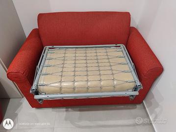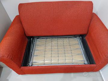 Divano letto due posti con letto interno singolo,due cuscini arredo e cuscini divano sfoderabili. Mai utilizzato. Misura rete interna 1.85×78cm , divano 130×70.