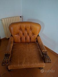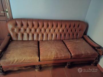Divano letto in pelle e legno massello misure 2metri larghezza x 90Cm profondità. E' ben conservato, la pelle è ben conservata e invecchiata. Periodo anni 1950 Poltrone in abbinamento stesse caratteristiche. Trasporto a cura dell'acquirente.