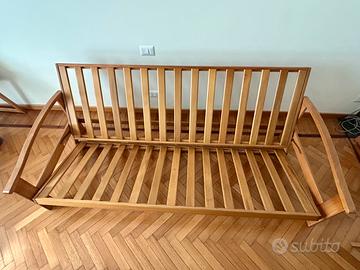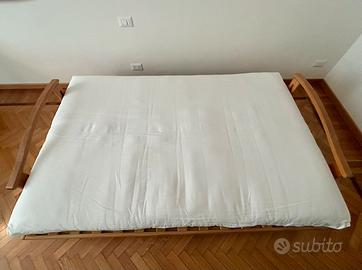 Divano letto Futon originale dimensioni aperto 140x209(195 letto). Dimensioni chiuso 105x209 Completo di copri-Futon in puro cotone bianco sfoderabile con chiusure lampo. In ottime condizioni, con lievi segni di uso.