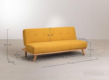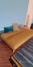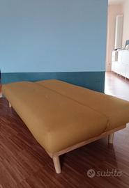 Vendo Divano letto in lino, colore Ocra giallo, ad una piazza e mezzo, con struttura in legno di eucalipto. Schienale reclinabile regolabile, largo 173cm profondo 80 cm, seduta e schienale perfetti ( imbottitura in schiuma riciclata)