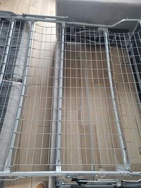Divano letto grigio chiaro. Rete con difetti di saldatura.