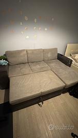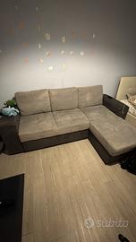 Divano letto grigio con penisola, vano sotto penisola e parte esteaibile per letto. Il divano si presenta in condizoni semi nuove. L’effetto del materiale che lo riveste e quello del simil pelle. Non presenta strappi, macchie o buchi. È largo circa 145 centimetri (nella zona della penisola) e lungo circa 220. Per informazioni e altro non esitate a contattarmi
