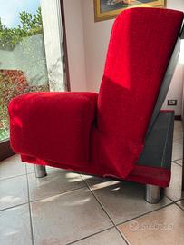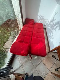 Divano letto rosso ben tenuto senza tagli o macchie . Si apre con facilita . Lungezza 1,90 Larghezza 1,20 Tre livelli di regolazione per lo schienale .