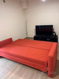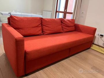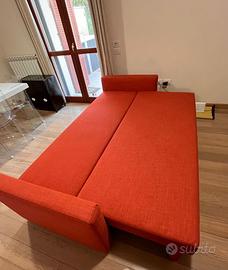 Divano letto Ikea modello Friheten misura 225x105 a tre posti colore arancio-corallo. Misura letto aperto 200x140. Divano come nuovo, usato pochissimo, con pratico vano contenitore sotto il sedile.