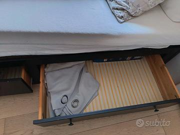 Vendo per cambio arredamento divano letto Ikea con struttura in legno. Il divano letto può essere utilizzato sia come letto singolo che come letto matrimoniale tirando una seconda rete a scomparsa. È provvisto ei due cassettoni comodi pr riporre cuscini e coperte. Compresi nel prezzo i due materassi, 8 cuscini e 2 set fatti a mano per coprire cuscini e materassi in due diverse fantasie.