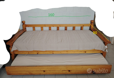Divano letto in legno massello, robusto e in buone condizioni generali. Struttura solida con secondo letto estraibile sotto, completo di 2 materassi in buono stato. Ideale come letto singolo che diventa matrimoniale o come soluzione per ospiti.