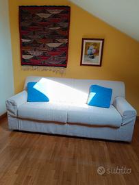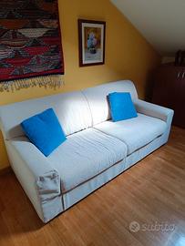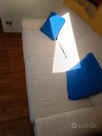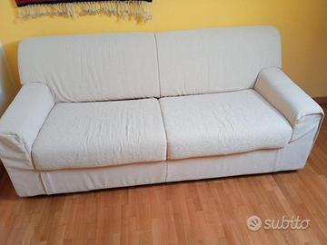 Vendo divano letto usato, rivestito in un pregiato tessuto panna, morbido e candido come una nuvola d’estate. Nonostante l’usura, si presenta in ottimo stato estetico: elegante, accogliente e imponente come un trono domestico.