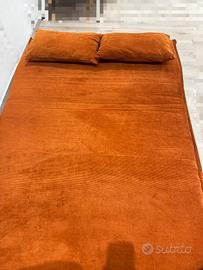 Questo divano è rivestito in morbido velluto in stile retrò ulteriormente sottolineato dalla tinta arancione scoiattolo. confortevole in vellutto con 2 Cuscini, trasformabile in due secondi divento un letto matrimoniale.