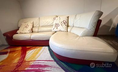 Divano letto in vera pelle angolare con penisola a destra, letto matrimoniale francese, bicolore bordeaux e panna. Materasso incluso. Si regala anche ulteriore materasso aggiuntivo se si desidera maggiore comfort.