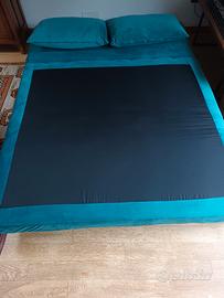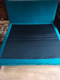 divano letto Maison du Monde con due cuscini sfoderabili cm 150 x 180 aperto, cm 80 altezza e 73 cm profondità da chiuso, verde petrolio con movimento basculante della spalliera.