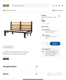 Vendo divano letto Ikea, modello LYCKSELE, matrimoniale alla francese, con struttura in acciaio e doghe in multistrato di legno, e materasso MURBO (attualmente arrotolato nel cellofan) in poliuretano, alto 10cm, con fodera completamente asportabile e lavabile. Entrambi gli articoli sono nuovi e mai utilizzati, ma da pulire, essendo stati conservati in magazzino. Il prezzo conpleto in negozio è di 274 euro. Ritiro di persona a Sant’Angelo Lodigiano, o possibilità di consegna a domicilio. Misure divano: Profondità sedile: 60 cm Altezza sedile: 39 cm Larghezza: 142 cm Misure letto: Lunghezza letto: 188 cm Larghezza letto: 140 cm Altezza letto: 87 cm